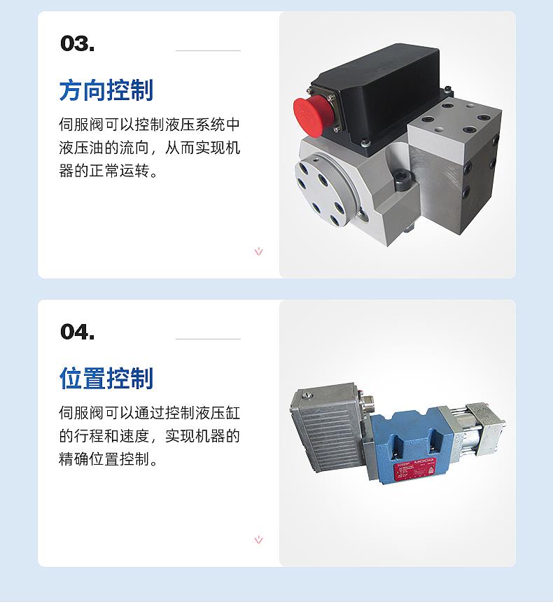 Servo valve has the characteristics of fast response, high control accuracy and strong repeatability, so it is widely used in injection molding machines, machine tools, aircraft control systems and other fields.